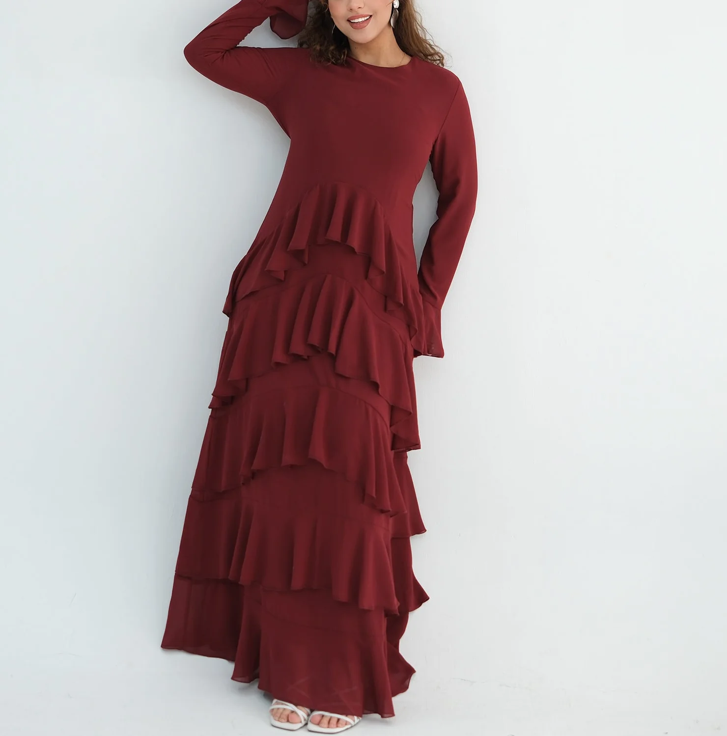 This effortlessly feminine tiered maxi dress features a modest round neckline and long sleeves for a refined silhouette. Cascading layered ruffles create beautiful movement with every step, while the soft, lightweight fabric drapes gracefully. Perfect for special occasions, evening gatherings or Eid celebration.