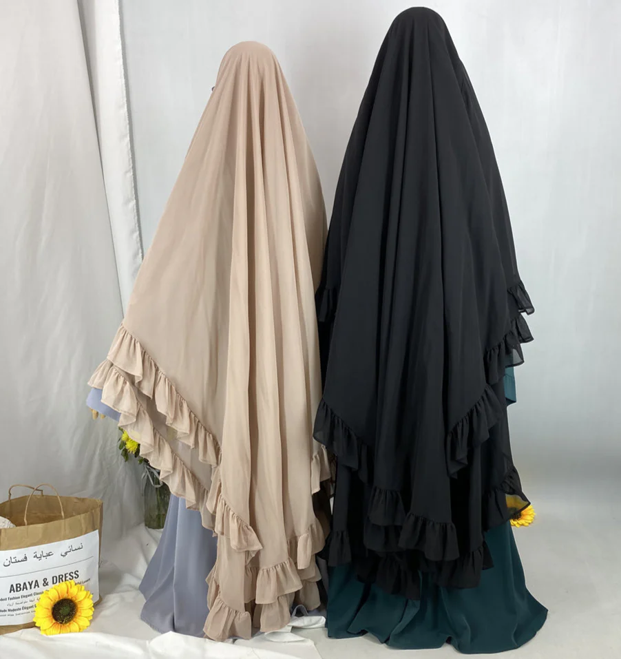 Elegantly designed for maximum coverage, this extra-long layered khimar flows beautifully over any abaya. Its lightweight, modest silhouette offers both comfort and sophistication—an essential piece for your modest wardrobe.