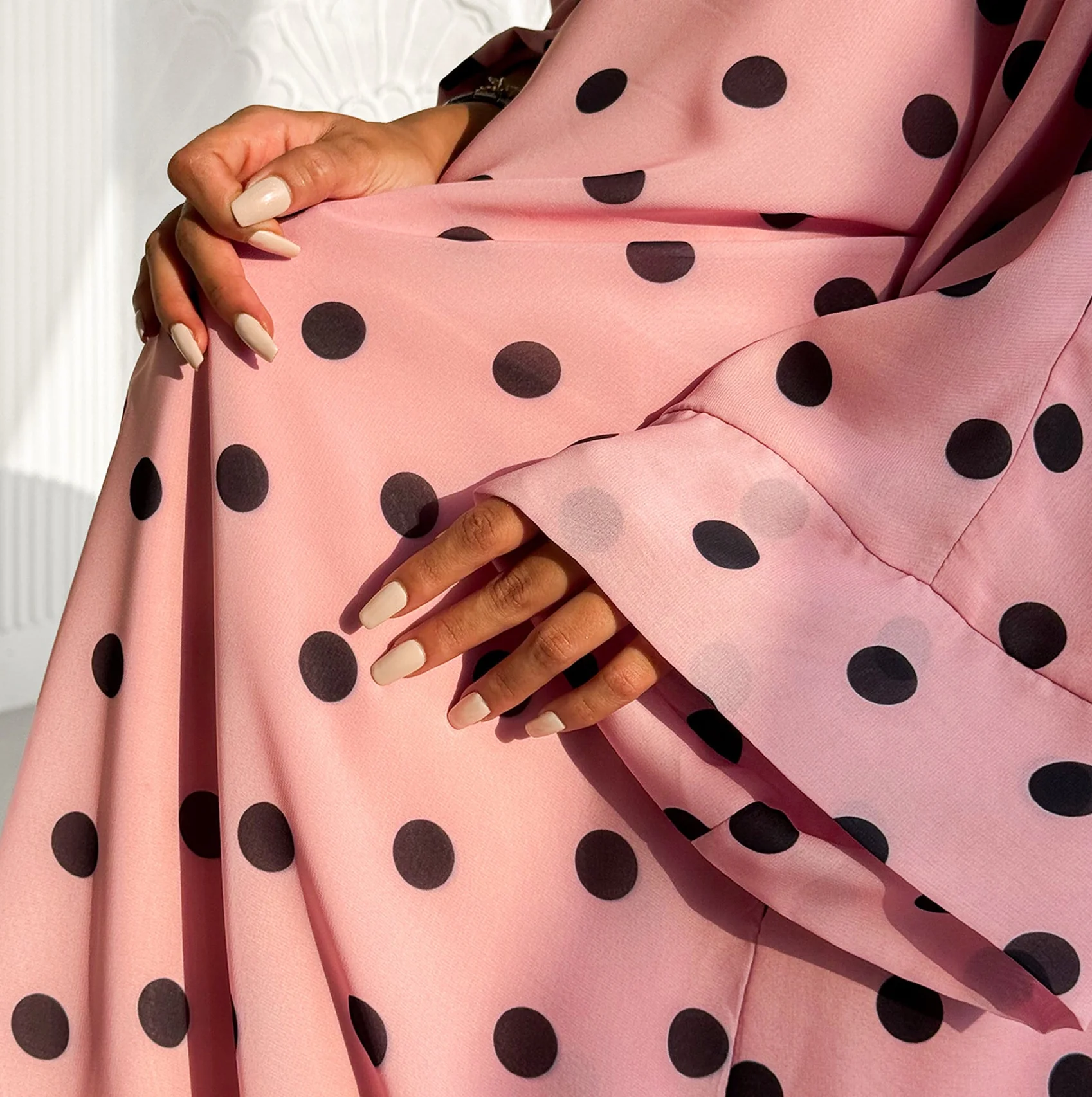 Lightweight and breathable, the fabric moves beautifully and provides a comfortable fit for all-day use. The subtle polka-dot pattern adds a touch of charm while keeping the overall style modest and refined.