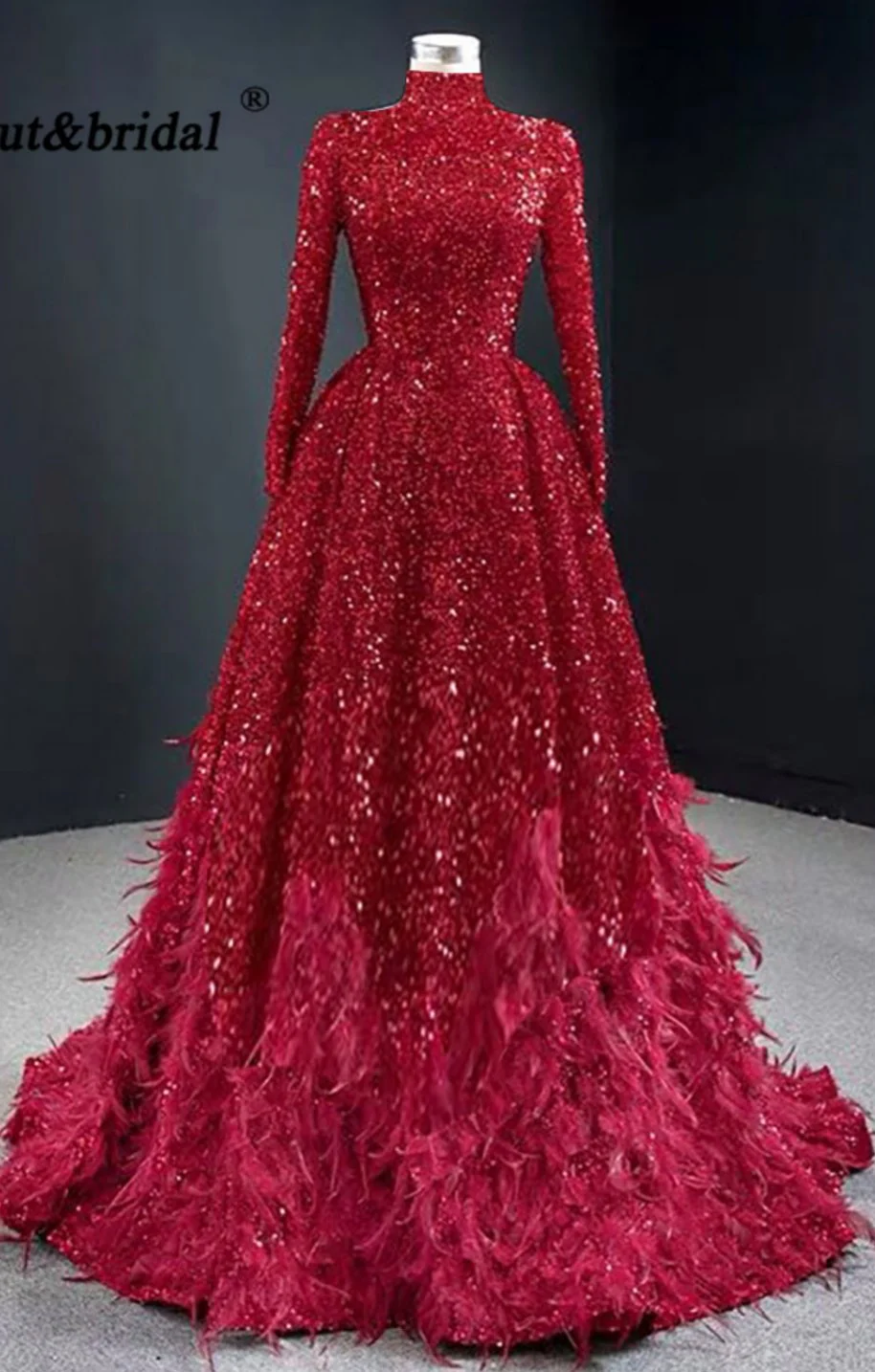 Featuring a sequin gown with high neck and feather detailing. This gown is a luxurious wear for any formal event. The gown can also be made with a round neck if preffered.
