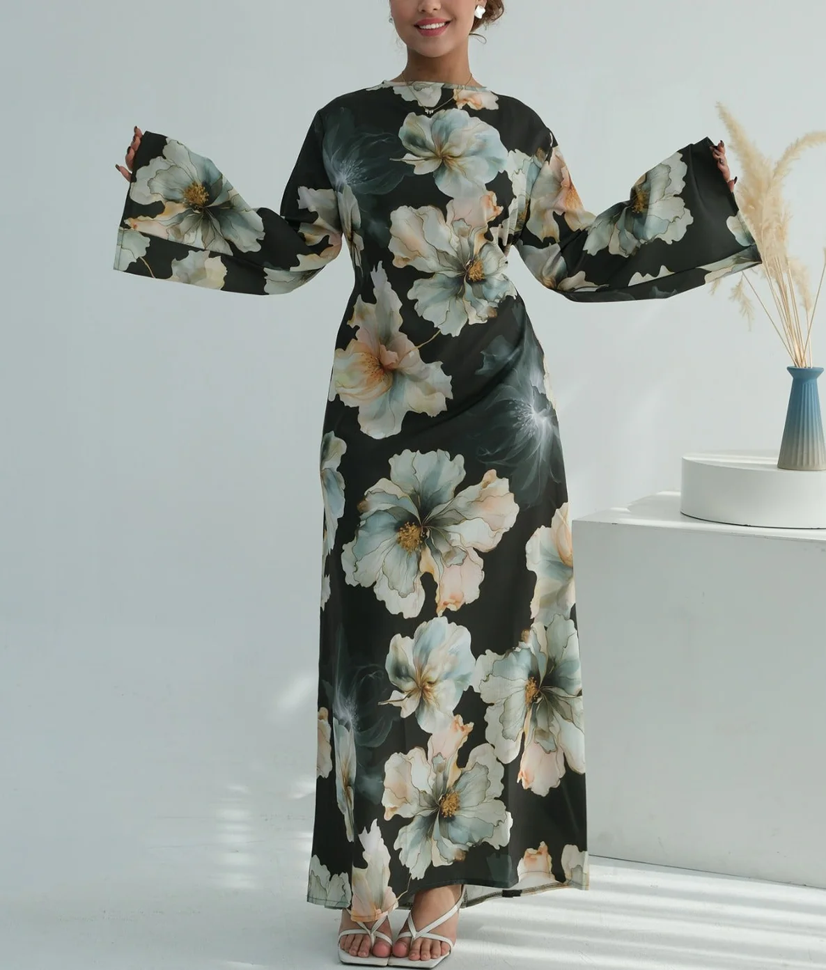 Graceful and modest maxi dress designed with a flattering flow and wide sleeves. The dress features a beautiful floral print and includes adjustable strings at the back to tie for a better fit. Made from lightweight, textured fabric that offers comfort and elegance for any occasion. Pair it up with our soft Modal Hijab to complete the look!